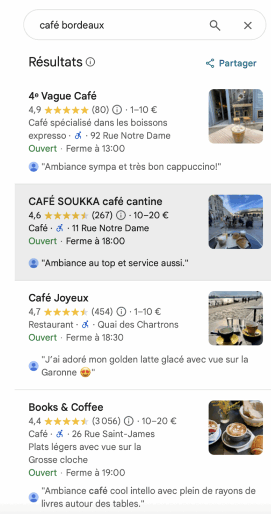 Mais les avis vont bien au-delà de l’influence sur le comportement des utilisateurs. Ils impactent directement votre référencement local sur Google Maps.
